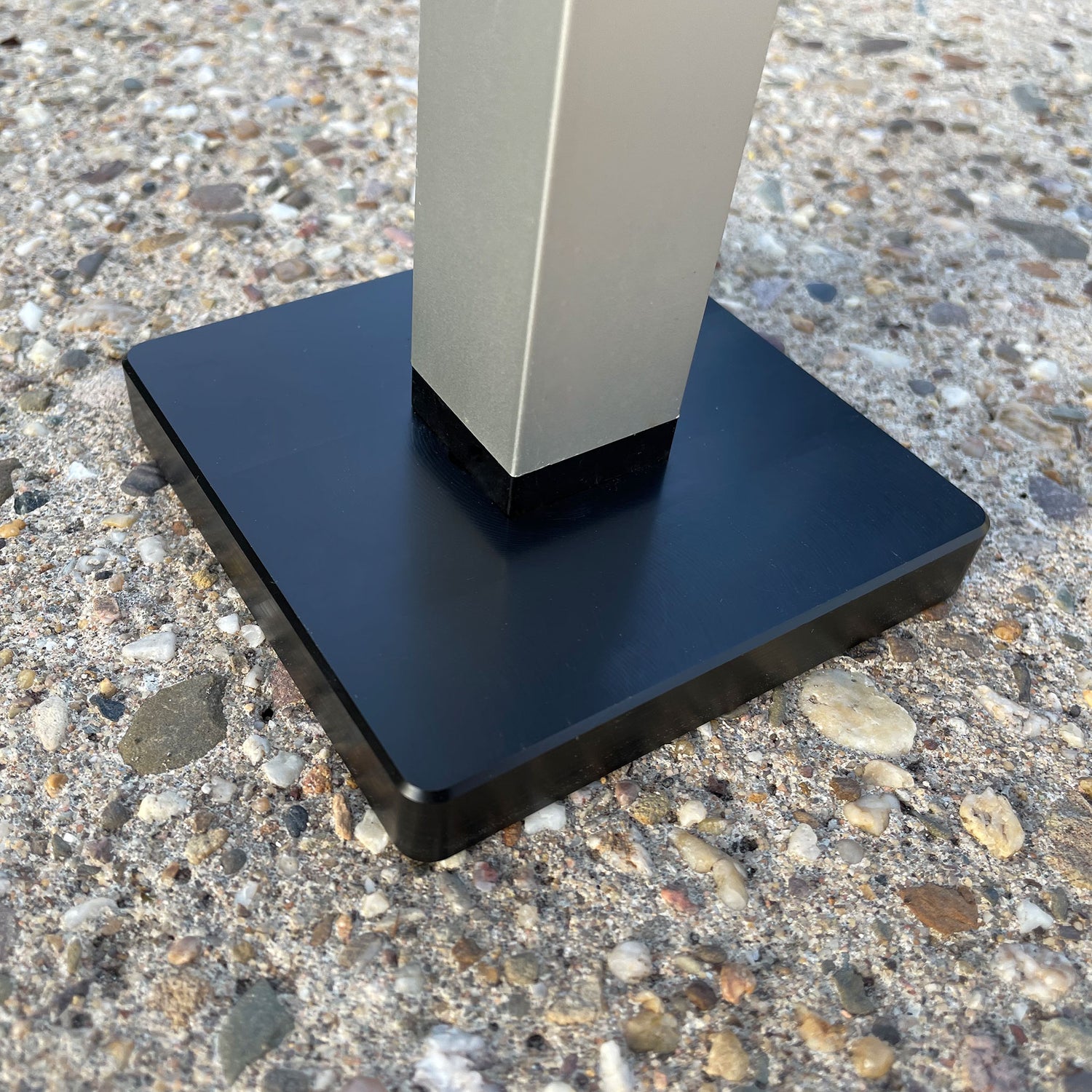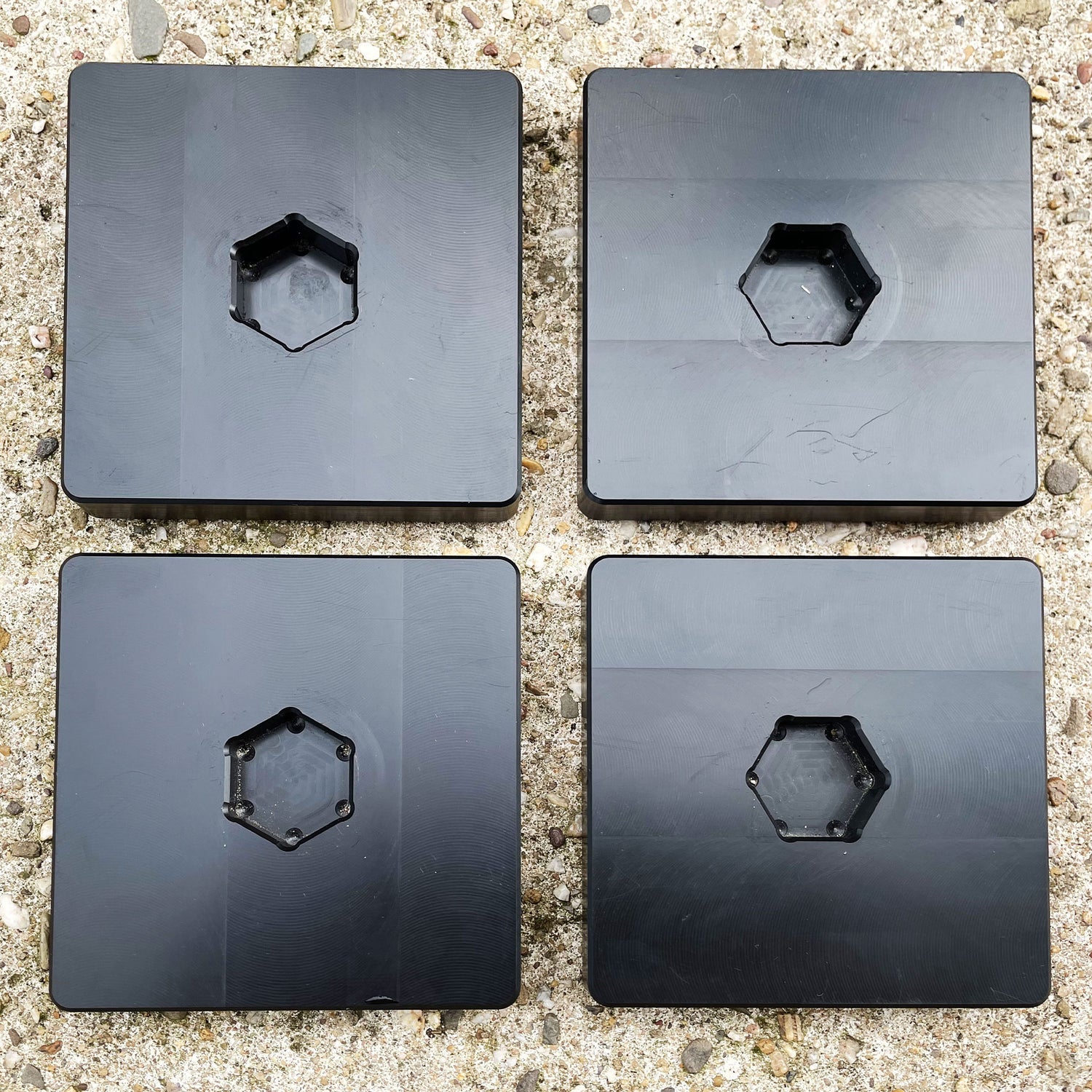 Die Fuß-Teller sind 10 x 10 cm groß und 1,5 cm hoch. Sie bestehen aus dem hochwertigem Kunststoff POM. Jeder Fuß-Teller hat in der Mitte eine exakt gefräste 6-eckige Vertiefung in die der verstellbare Schraub-Fuß der SkyHeia genau hineinpasst. So lässt sich die SkyHeia auch mit den Fuß-Tellern noch Ecke für Ecke in der Höhe justieren, vor allem für die Übernachtung im unebenen Gelände unerlässlich.